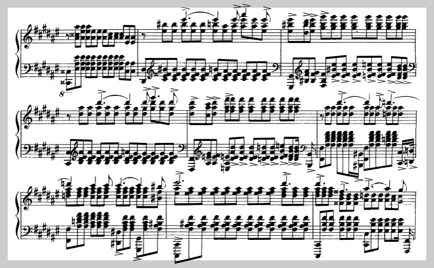 쇼팽의 음악은 손에 착 잘 달라붙는 포지션이 나오지만 스크리아빈의 음악은 그렇지 않다. 손가락을 편안하게 굴릴 수 있는 포지션보다는 왠지 불편한 포지션이 많다. 하지만 스크리아빈의 음악에서 자주 등장하는 화음부분의 연타는, 새까맣게 보이는 음표들에 비해서는 패턴이 있어 의외로 악보 보기가 쉽다.